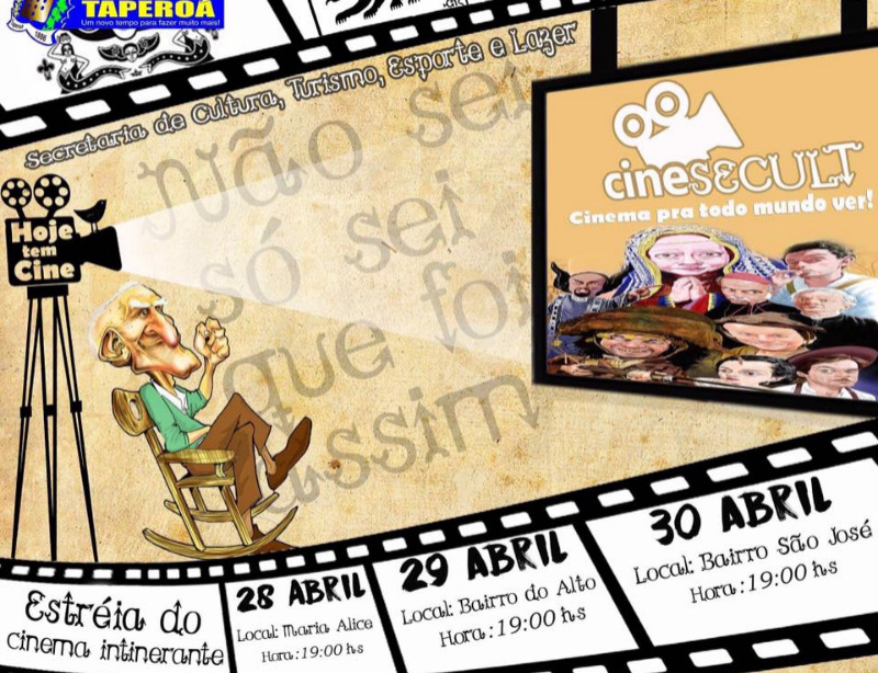 A Prefeitura Municipal de Taperoá, através da Secretaria de Cultura, Turismo, Esporte e Lazer, convida a todos os taperoaenses a prestigiarem a estreia do CINESECULT, cinema pra todo mundo ver!