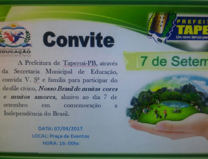 A Prefeitura de Taperoá, convida a população taperoaense para a Solenidade Alusiva ao dia 07 de setembro, Dia da Independência Do Brasil. A Solenidade será realizada na Praça de eventos, às 16:00 horas.