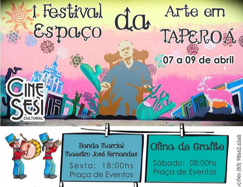 A Prefeitura Municipal de Taperoá em parceria com a Coordenação de Cultura realizará no início desse mês, Abril, o 1º Festival Espaço da Arte em Taperoá. Essa programação fará parte do calendário de eventos culturais da cidade proporcionando a população três dias de arte, lazer e cultura, além de, incluir os Grupos Culturais da cidade para complementar a programação do CineSesi Cultural que se faz presente no Município.