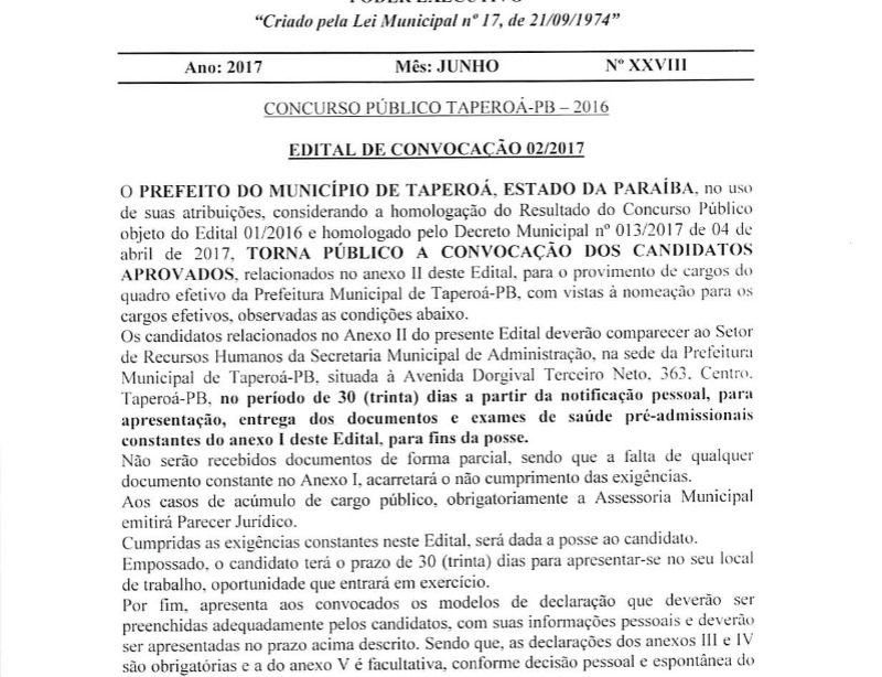 A Prefeitura de Taperoá divulgou na manhã dessa quinta-feira,8, o segundo Edital de convocação dos aprovados no último concurso público.