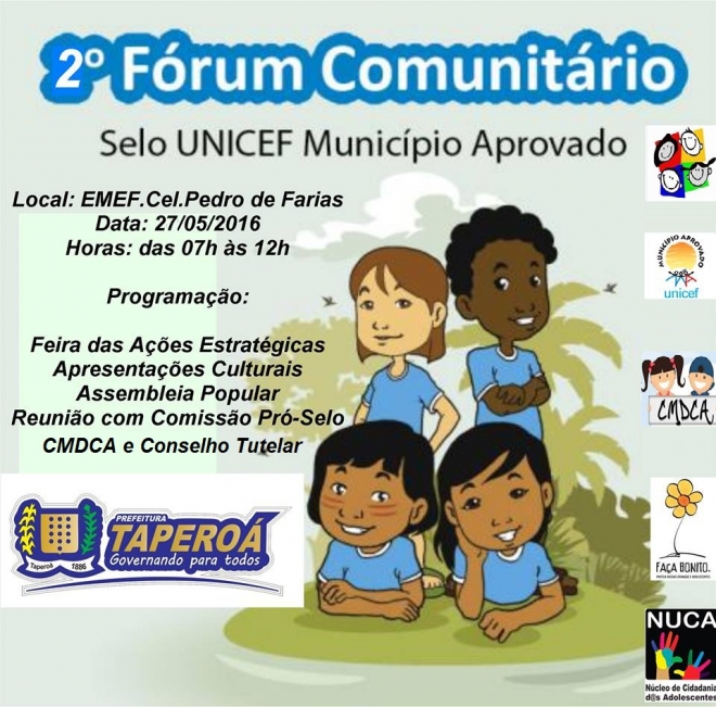 A cidade de Taperoá localizada no Cariri Ocidental Paraibano, distante 244km da capital João Pessoa, com aproximadamente 15.000 habitante, considerada um celeiro cultural, por destaca-se no cenário nacional com as produções da Rede Globo "A Pedra do Reino" e o "Auto da Compadecida" (Ariano Suassuna), também sediou e estrelou espetáculos em 4 Festivais Internacionais de Folclore e na Europa com a participação do Grupo de Cultura "Os Cariris", promoverá o 2º Fórum Comunitário do Projeto Selo UNICEF Município Aprovado edição 2013/2016, no dia 27 de maio, à partir das 7 horas, na EMEF. "Cel. Pedro de Farias", situada à rua Manuel Guimarães no bairro São José.